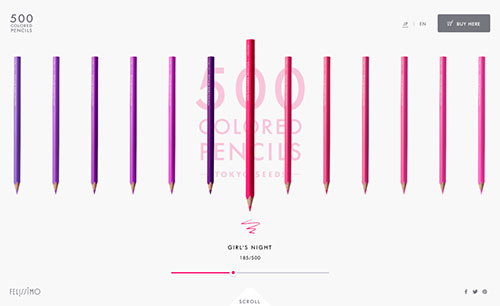 一支彩铅都要做这么漂亮的专题页,可见日本对设计、对品牌包装的重视程度。左右滑动的 JS 特效很好玩,看到这500支彩铅,小编也有点心动了
