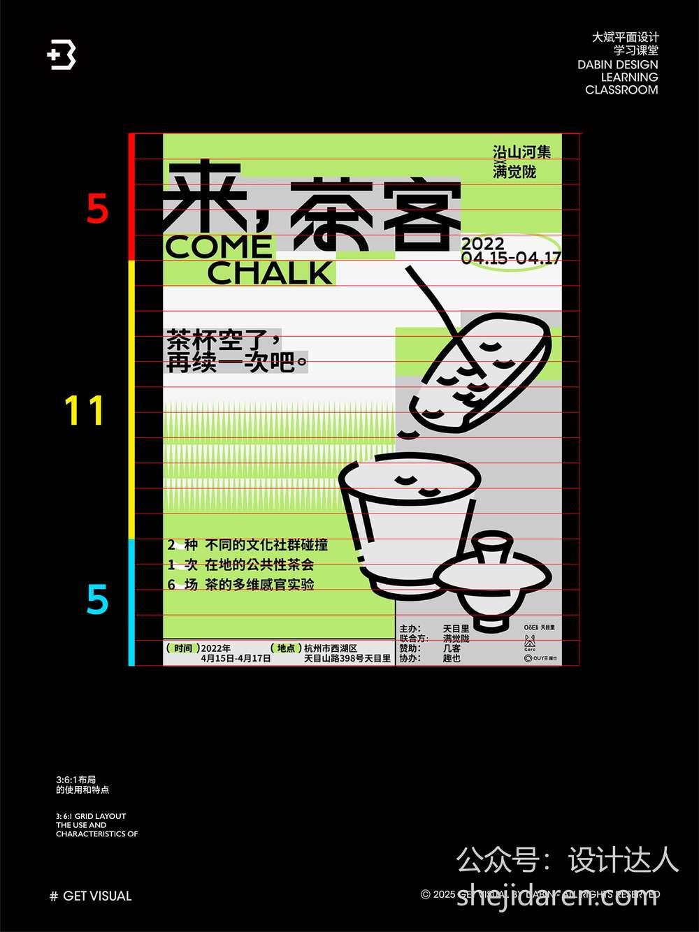 两个5栏和11栏对比,看似平衡,但因为上下5栏被中间区域隔开,又打破了这个面积上的平衡,所以这个网格应用可以让文字和图形即能产生视觉上的平衡又能有对比。