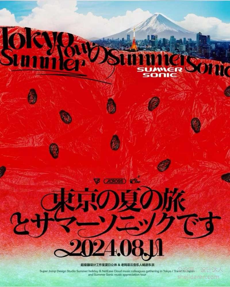 这张海报以红色的西瓜果肉为背景,上面点缀着黑色的西瓜籽,还融入了东京城市景观和富士山的元素,它传达出对东京夏日旅行的向往和期待,仿佛在邀请大家去感受东京夏日的魅力。