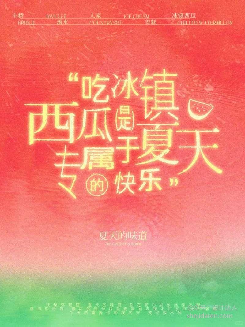 渐变的红色和绿色背景,就像西瓜的颜色。中间大大的黄色文字 “吃冰镇西瓜是属于夏天的快乐” 直接道出了夏天的专属快乐,看到这张海报就能感受到那种吃着冰西瓜的惬意啦。