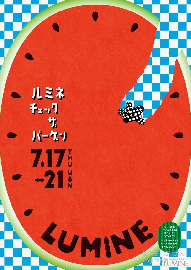 红色西瓜造型在蓝白格子背景上,有一块西瓜被切走,露出西瓜籽,还有 “LUMINE” 字样和 7 月 17 – 21 日的日期。它可能在传达夏日的清凉和趣味,感觉像是在宣传某个有趣的夏日活动。