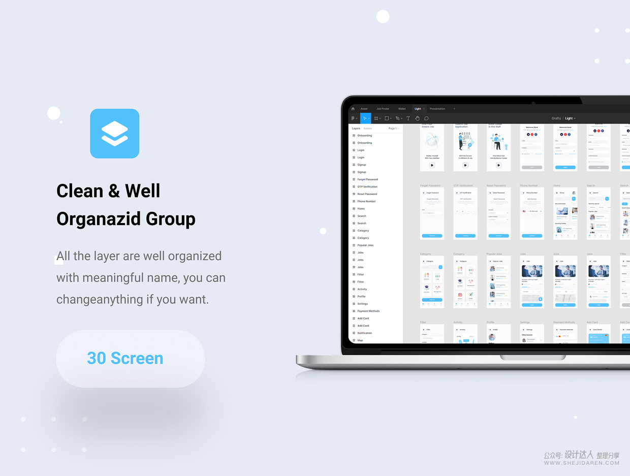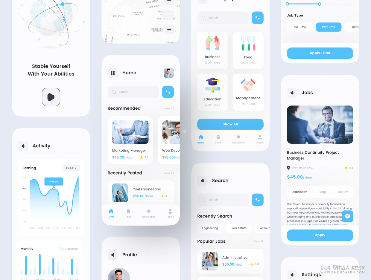 这是一款界面设计很好的求职应用。主要用于专业网络,包括雇主和求职者张贴他们的简历。免费访问数百万条招聘信息,个性化搜索,联系雇主并提交工作申请。包括Figma,Adobe XD,Sketch文件的高级应用程序。