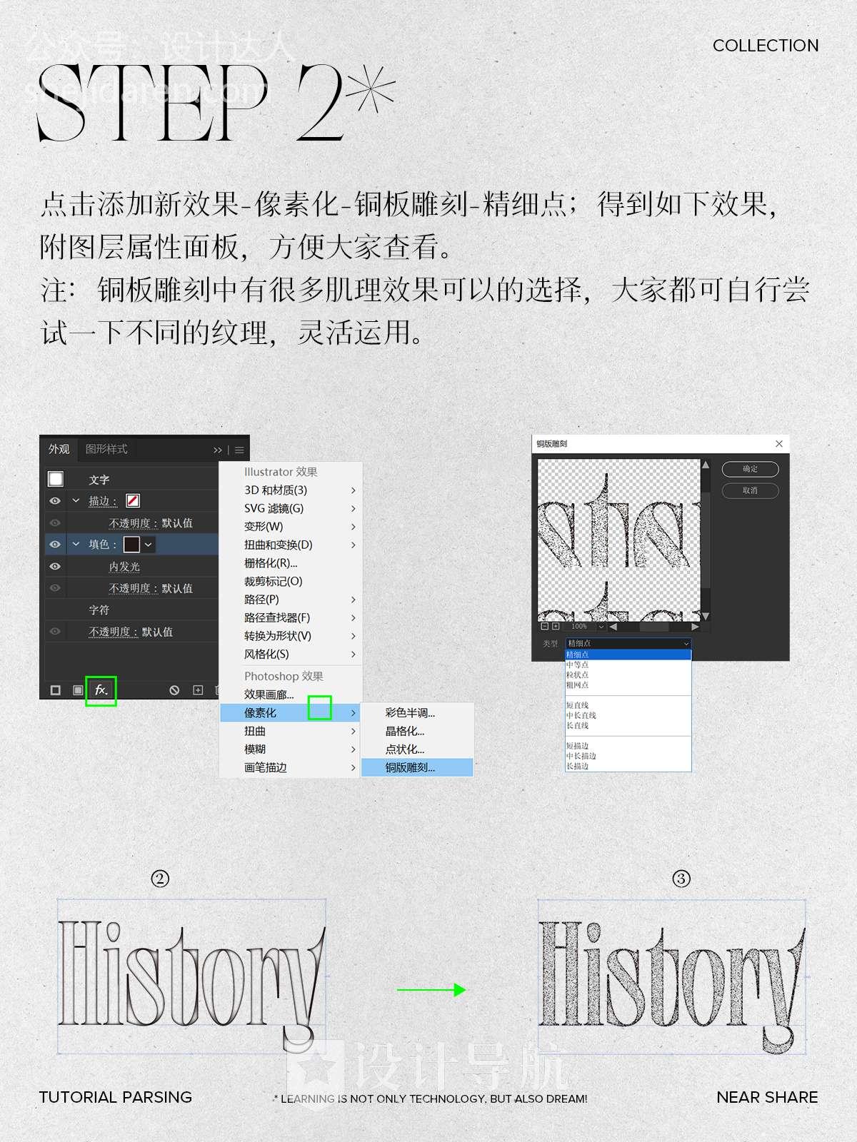 继续添加新效果 – 像素化 – 铜板雕刻,选择“精细点”以获得复古纹理效果。