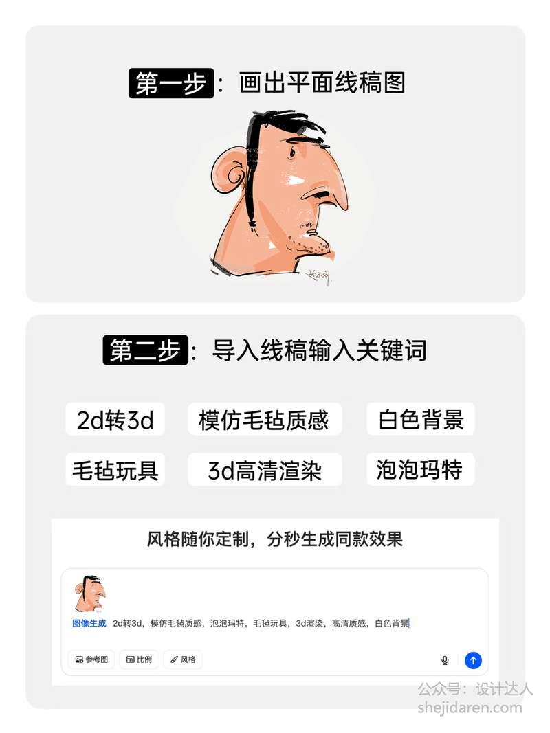 第二步:打开 AI 工具戳图片生成,导入画好的图之后,咒语直接抄作业:2d 转 3d、模仿毛毡质感、泡泡玛特风格、毛毡玩具、3d 高清渲染、白色背景… 等几秒就能收获一个像从童话里揪出来的毛毡小人!绒毛感超真实,细节控狂喜~