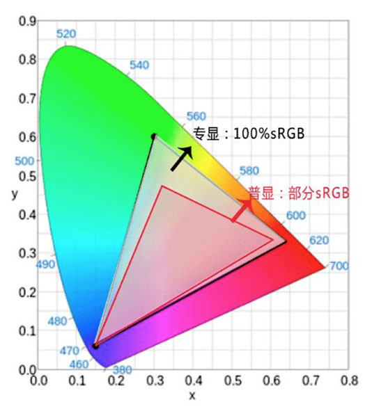色域:100%sRGB。参考下图,一般显示器的色域是96%~98%sRGB。假如色域无法达到100%,那这个显示器就不能完全显示所有颜色。