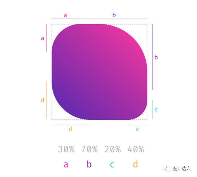 当设置多个 border-radius 数值时,从左上角开始顺时针设置,您还可以使用百分比单位,甚至可以与固定值混合使用。