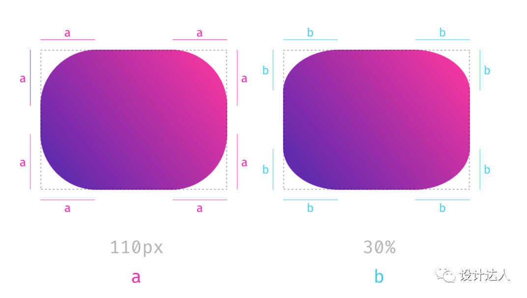 让我们看看「border-radius: 110px」与「border-radius: 30%」的矩形会是什么样的,请看下图例子: