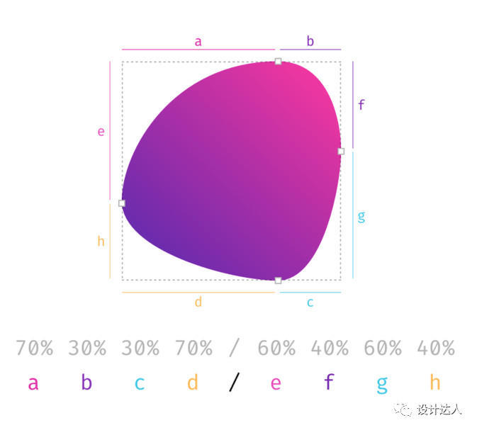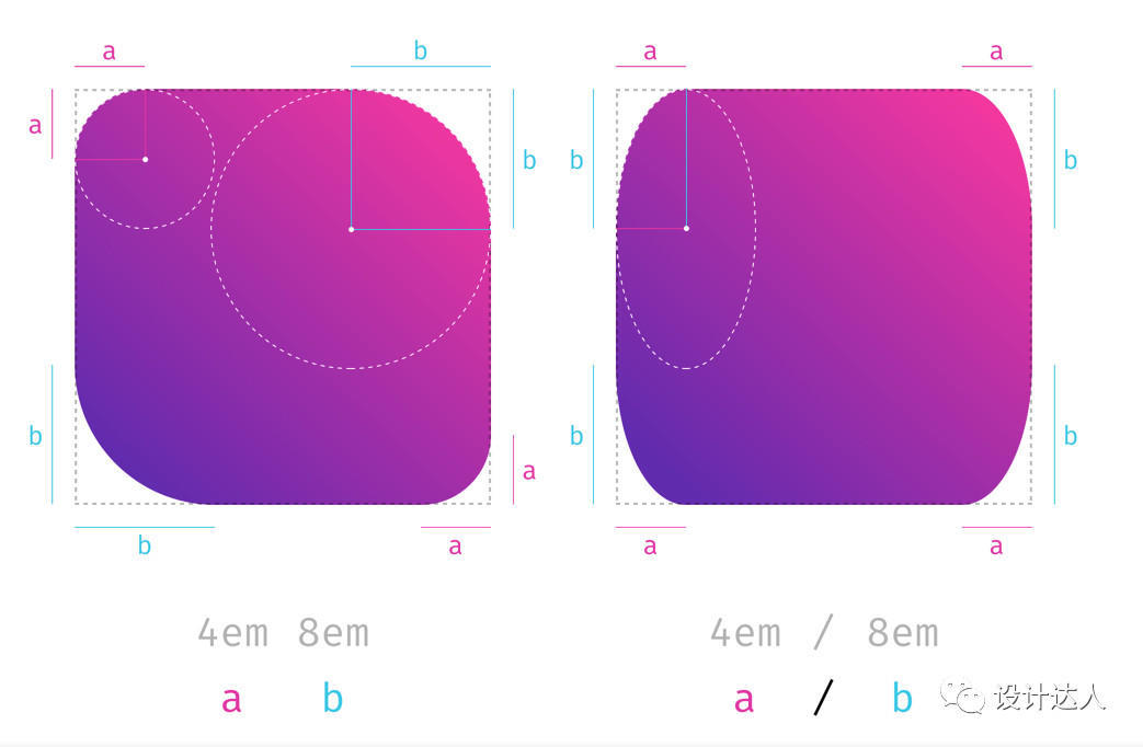 Border-radius 最多可以使用8个数值,这就可以给设计师带来更多创意空间了,注意,需要作用斜杠「 / 」来分隔4个值,这是规范。