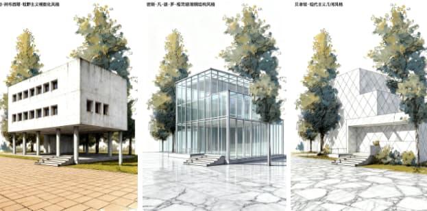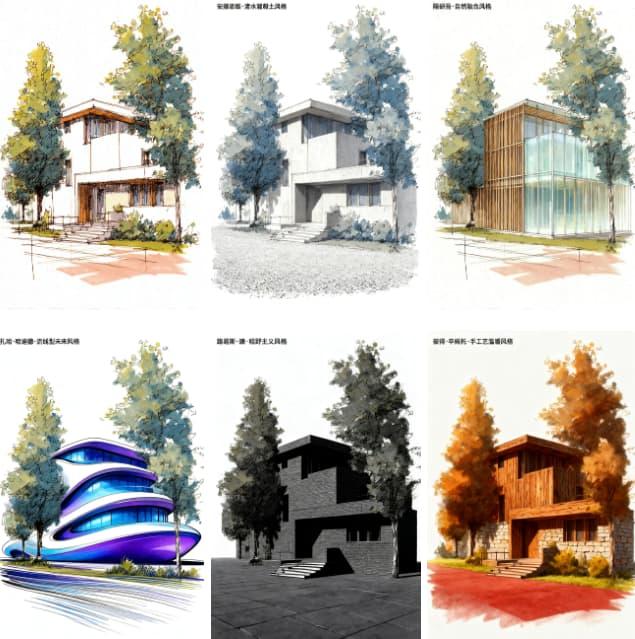 来一个能体现它知识能力的案例,比如我没有在提示词中写明文字,但是让它备注建筑师名字+风格,它会像这样输出。整体可能不太准,目前主要是对于建筑设计大师部分作品的要素提炼: