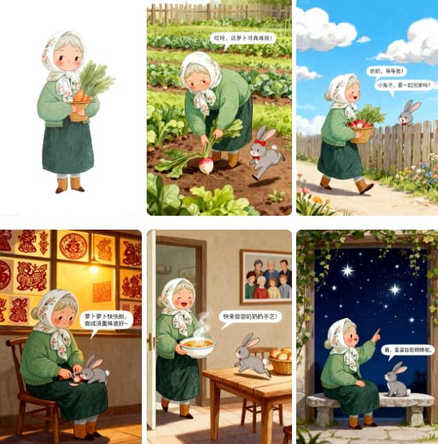 基于老奶奶角色使用6张图输出一个趣味童话故事,包含多个角色、对话气泡和声音音效等。