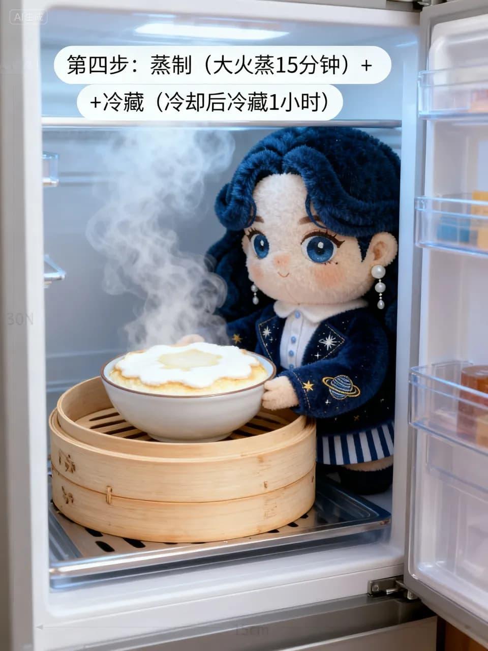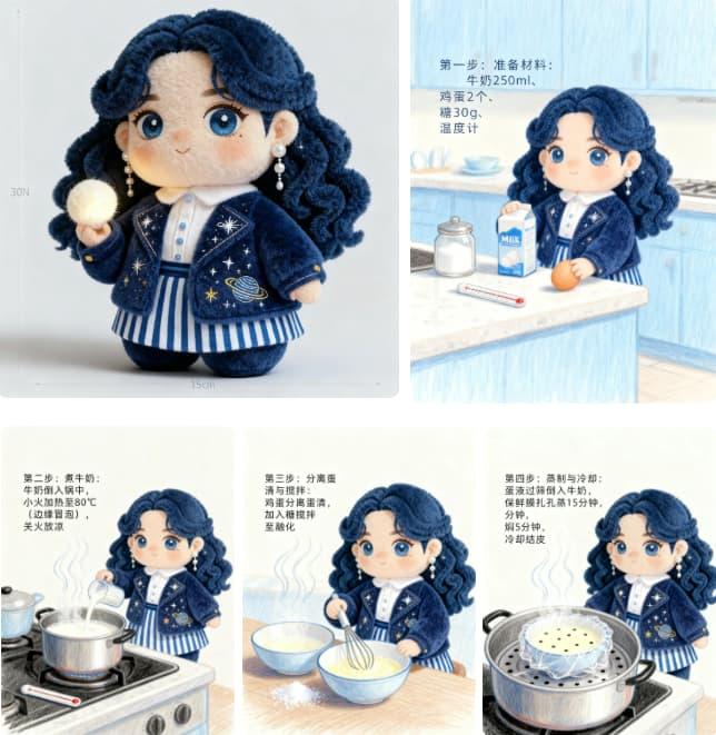 通过4张图详细描述双皮奶制作步骤教程图,步骤说明要中文,风格采用卡通彩铅风格,步骤清晰,如果出现人物,比例要合理。