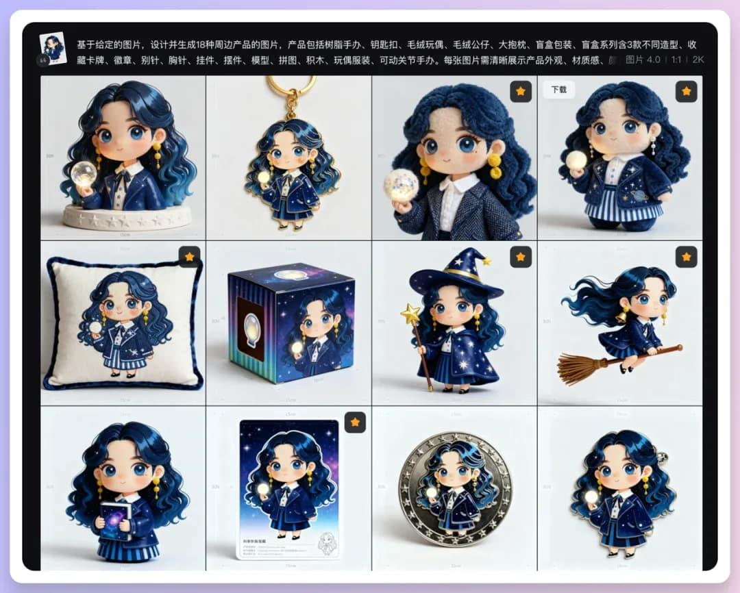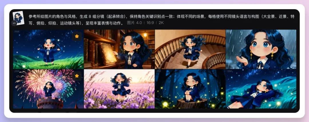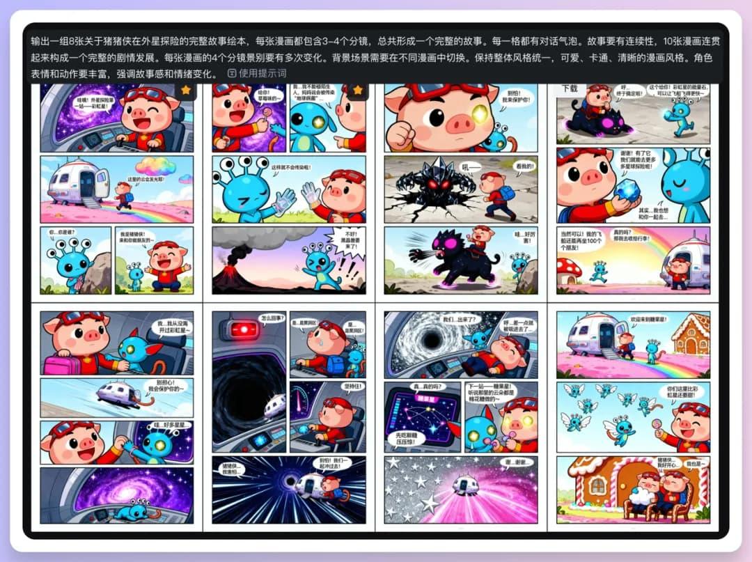多图输入输出:可同时上传多张图进行组合、迁移、替换等复杂编辑;可以一次性生成多张相关联的图像,非常适合分镜草稿创作或灵感脑暴。