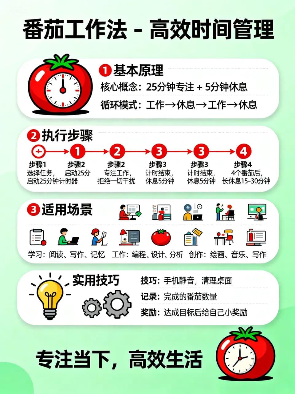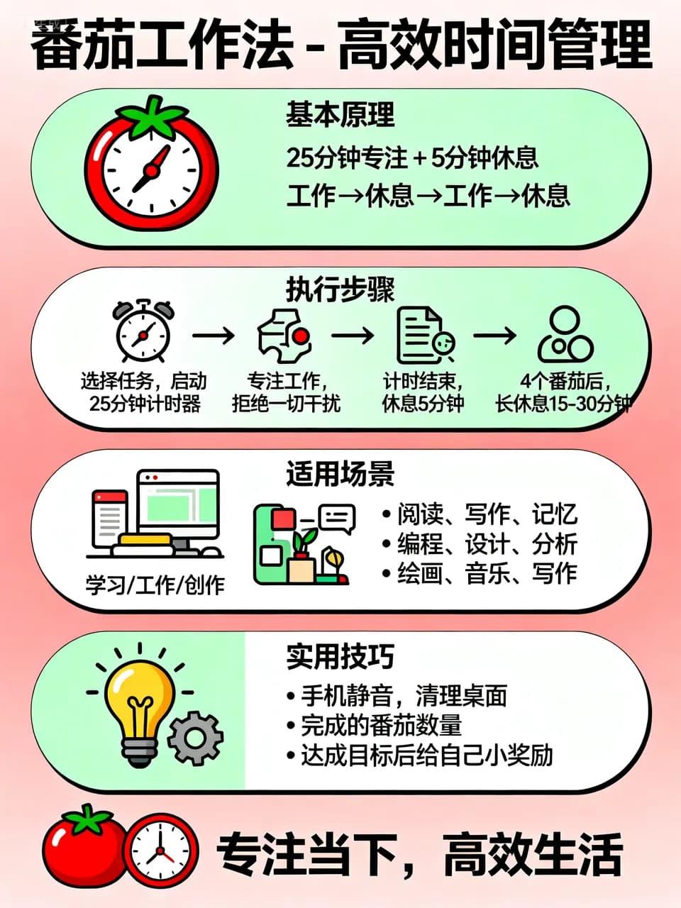 步骤4:”4个番茄后,长休息15-30分钟”3. 适用场景
