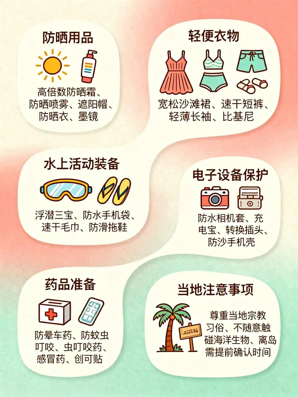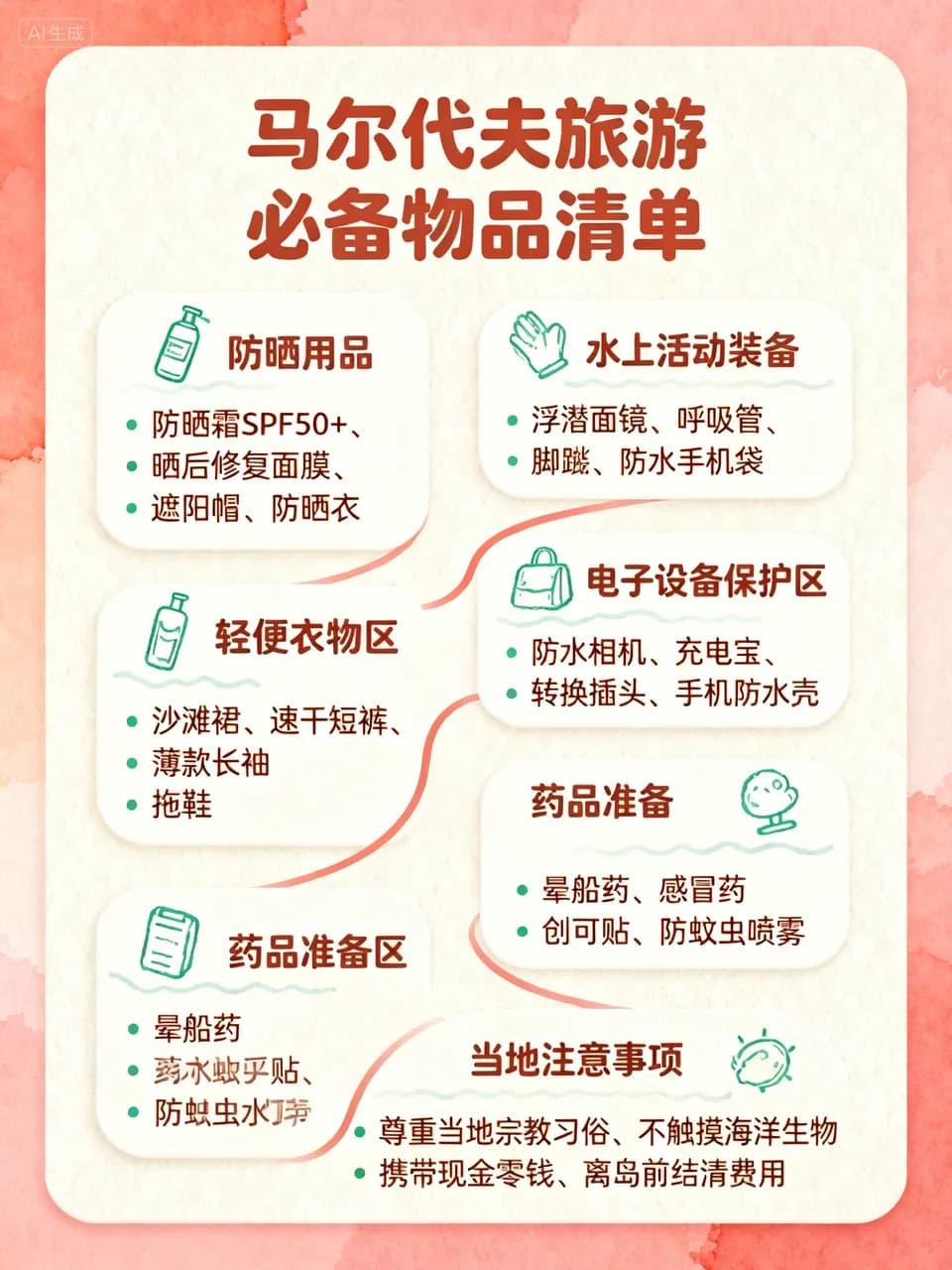 制作一个马尔代夫旅游必备物品清单,包含插图、防晒用品列表、水上活动装备、轻便衣物推荐、电子设备保护、药品准备和当地注意事项。制作一个马尔代夫旅游必备物品清单信息图,采用温暖度假风格,使用米白、珊瑚粉、薄荷绿的柔和色调,包含防晒用品列表、水上活动装备、轻便衣物推荐、电子设备保护、药品准备和当地注意事项。使用圆角卡片、渐变背景、手绘风图标、友好字体、流动布局。