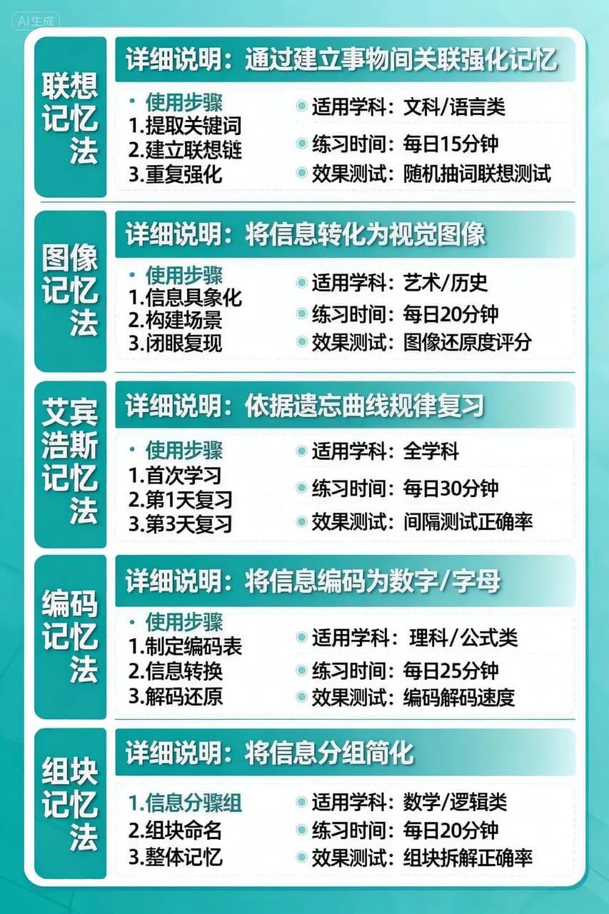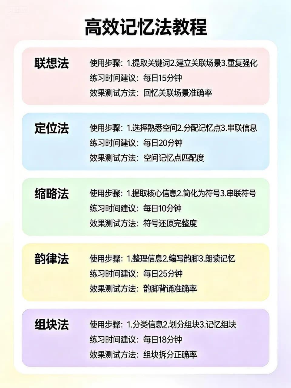 制作一个高效记忆法的信息图教程,包含5种记忆技巧的详细说明、每种方法的使用步骤、适用学科分析、练习时间建议和效果测试方法。制作一个高效记忆法的信息图教程,使用多彩色柔和色彩色块配色,包含5种记忆技巧的详细说明、每种方法的使用步骤、练习时间建议和效果测试方法,注意要有边缘留白。