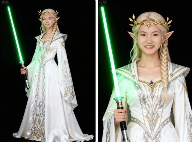 提示词:让图一的角色,换上图二的发型,换上图三的造型,拿着图四的武器,黑色背景。