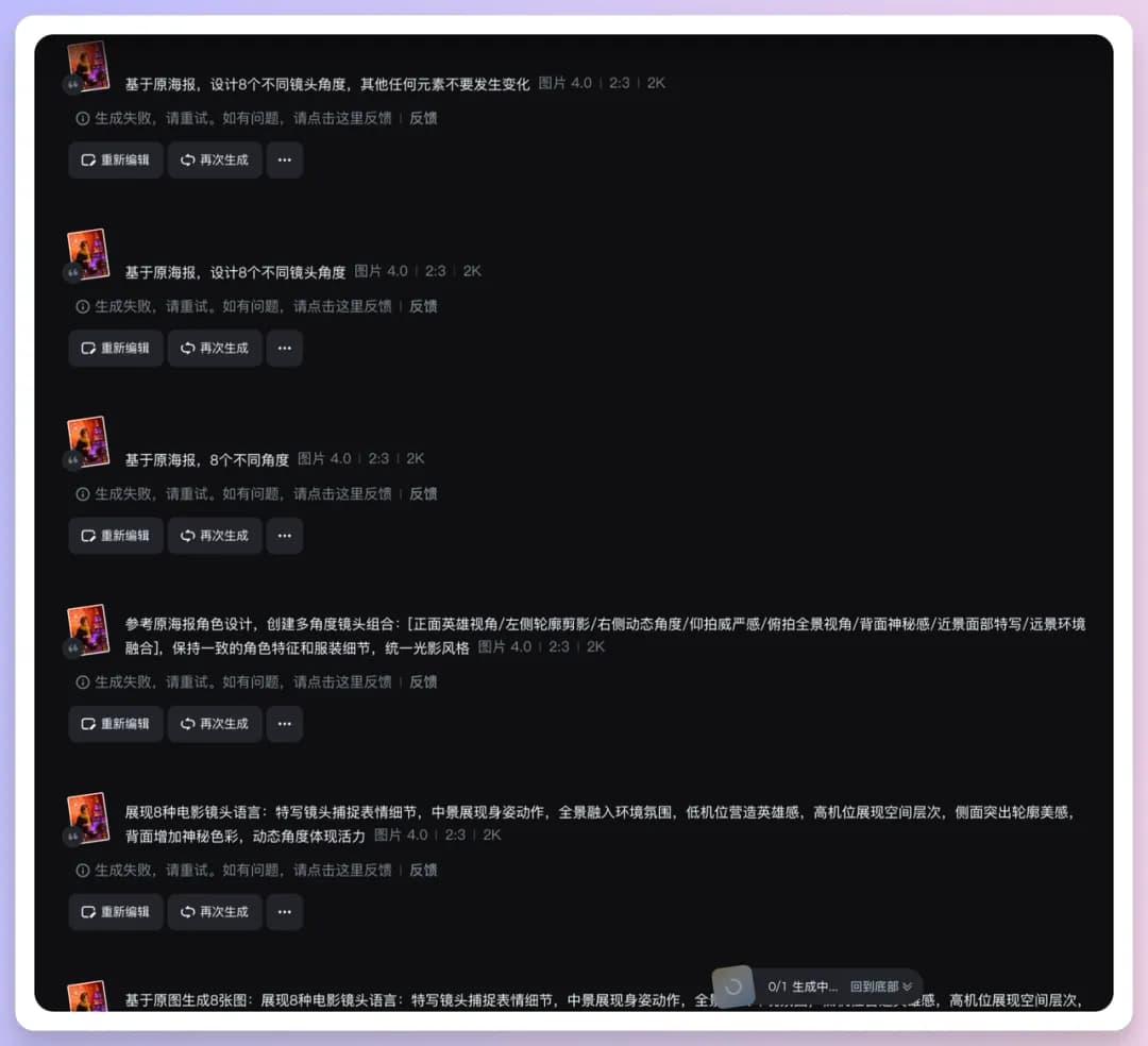 提示词限制:部分场景对提示词限制较多,导致无法输出图片,可以进行提示词微调后多次尝试。比如改变视图这个,我经常要尝试很多次,单个出几乎没有成功过。