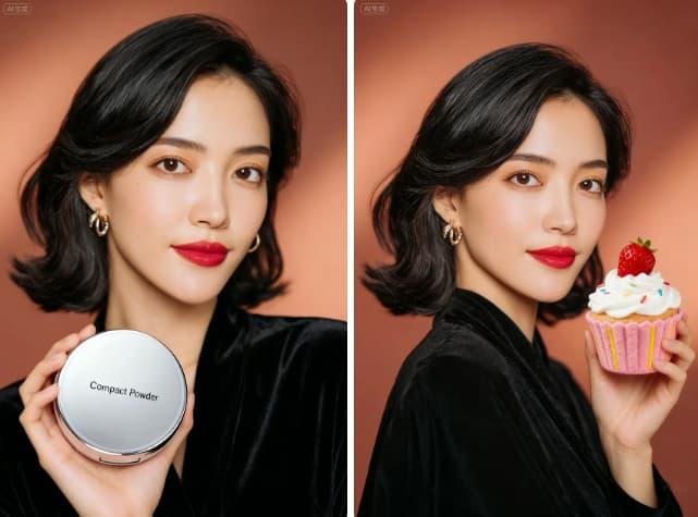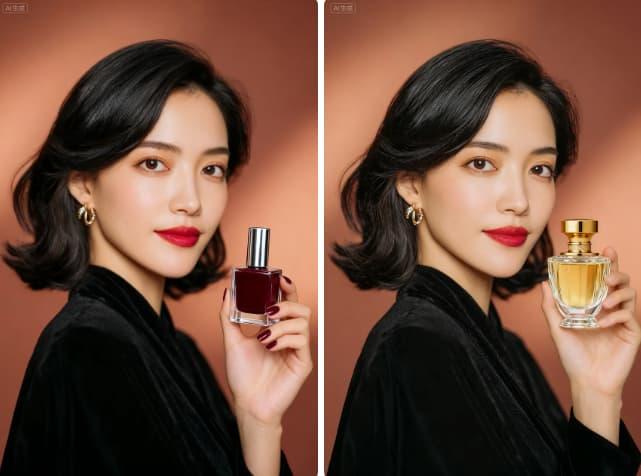 基于原图替换产品,同时保持人物一致性/注意看下方美甲的补全和姿势的切换,我认为这样的细微变化是非常合理的:
