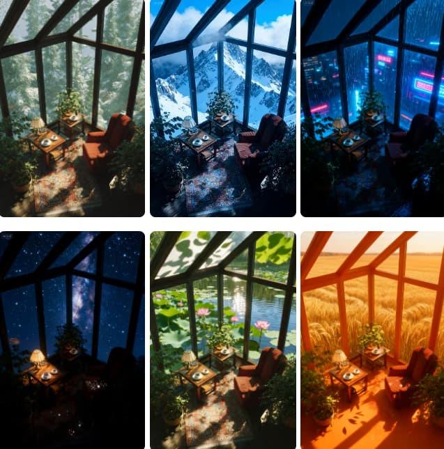 窗外场景替换,4个方案,保持室内布局不变,注意构图角度,根据窗外场景调整光影效果。
