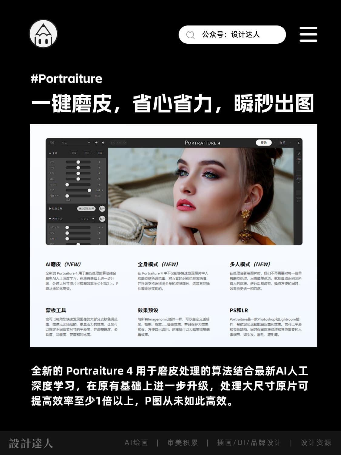 Portraiture插件大更新,各位WIN和Mac用户,尤其是摄影师和设计师们,好消息来啦!你们最爱的Portraiture插件已经更新,全面支持最新的Mac OS 14系统!这次设计达人整理了一键磨皮插件Portraiture的新版和旧版(最新为Portraiture4.5)。