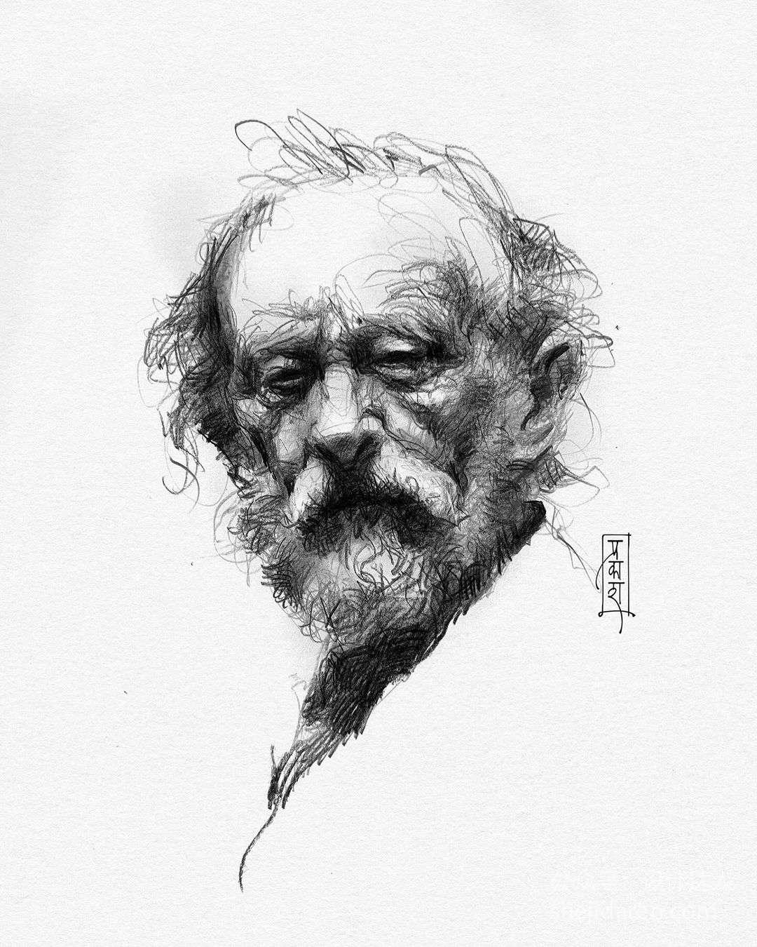 普拉卡什的速写以其简洁、流畅、清晰和诚实而闻名。他的每一条线条都是干净利落的,无需繁复的修饰,就能精准捕捉人物的精髓,展现其生动的性格和情感。他的作品不仅是艺术,更是对人性深刻的洞察和对生活真挚的体验。