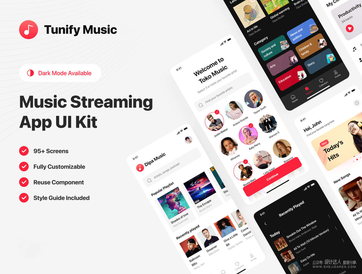 今天分享一个完美的音乐流媒体应用程序UI套件,由95+像素完美的屏幕组成,该套件很容易根据你的喜好完全定制,包括全局颜色、字体样式等,有明暗主题可选。简单、干净、现代的设计风格非常百搭。