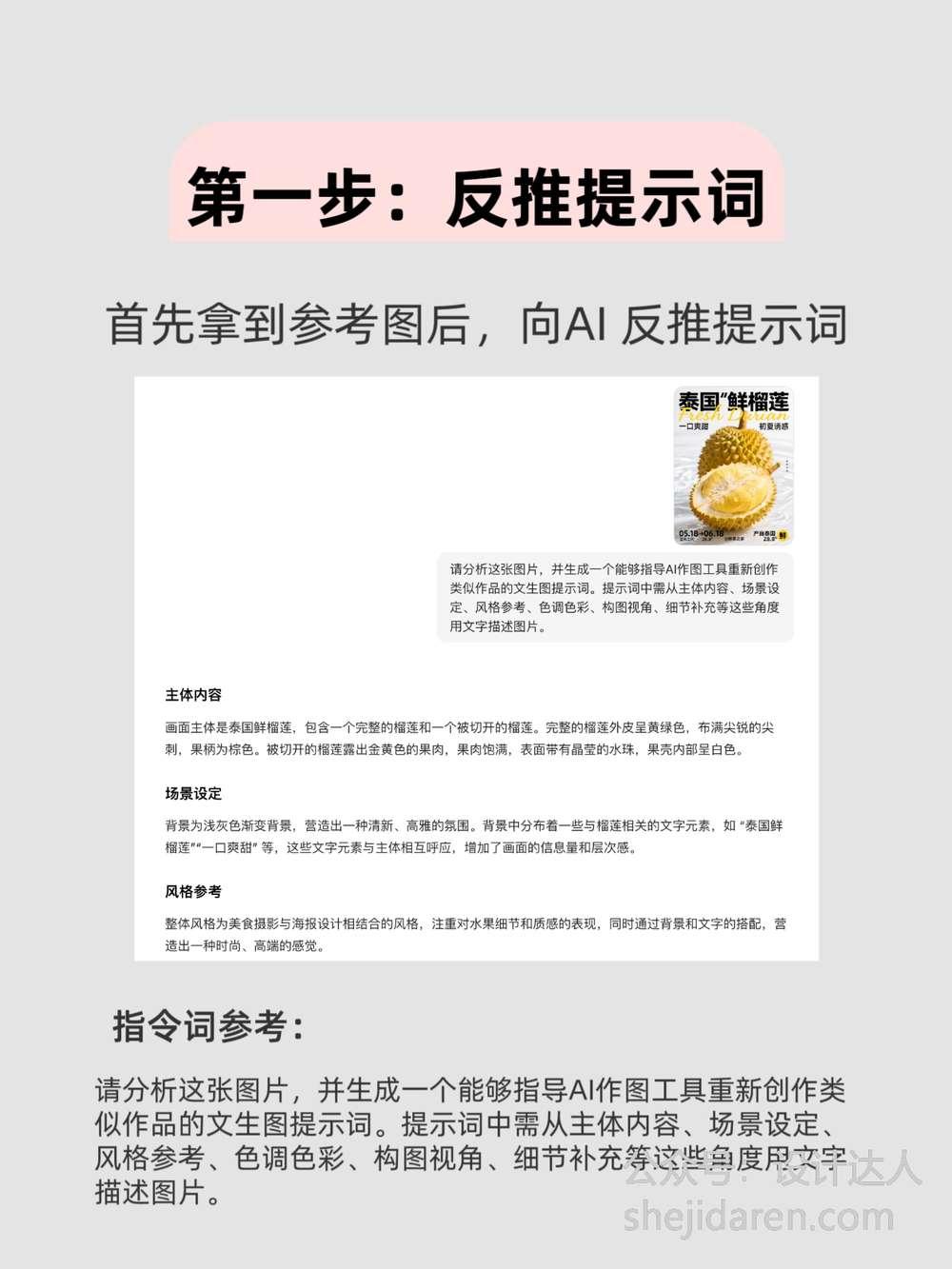 我们有两张参考图,一张是泰国鲜榴莲,一张是岭南鲜荔枝。拿到参考图后,我们要向 AI 反推提示词。