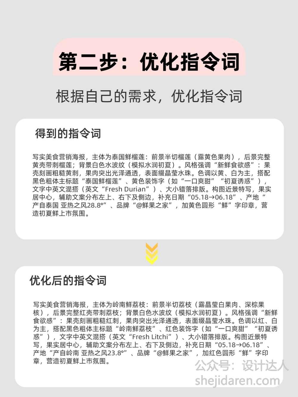 根据自己的需求去优化指令词。比如从写实美食营销海报角度,对主体、前景、后景、风格强调、色调、字体、构图、文案、日期、产地、品牌等多方面进行指令词优化。