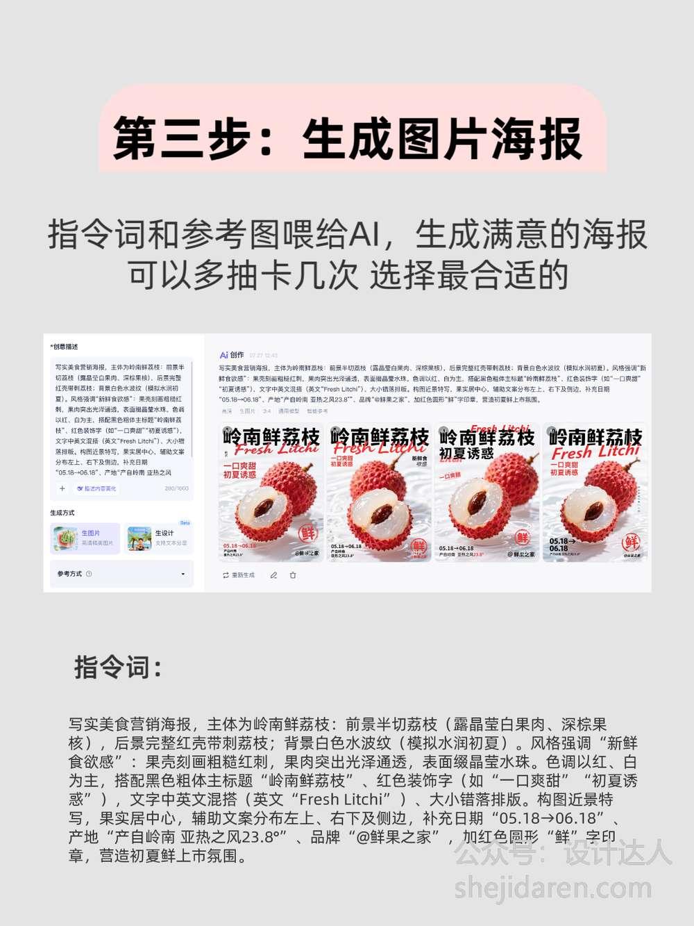 把优化好的指令词和参考图喂给 AI,就能生成满意的海报啦。如果一次不满意,可以多抽卡几次,选择最合适的。
