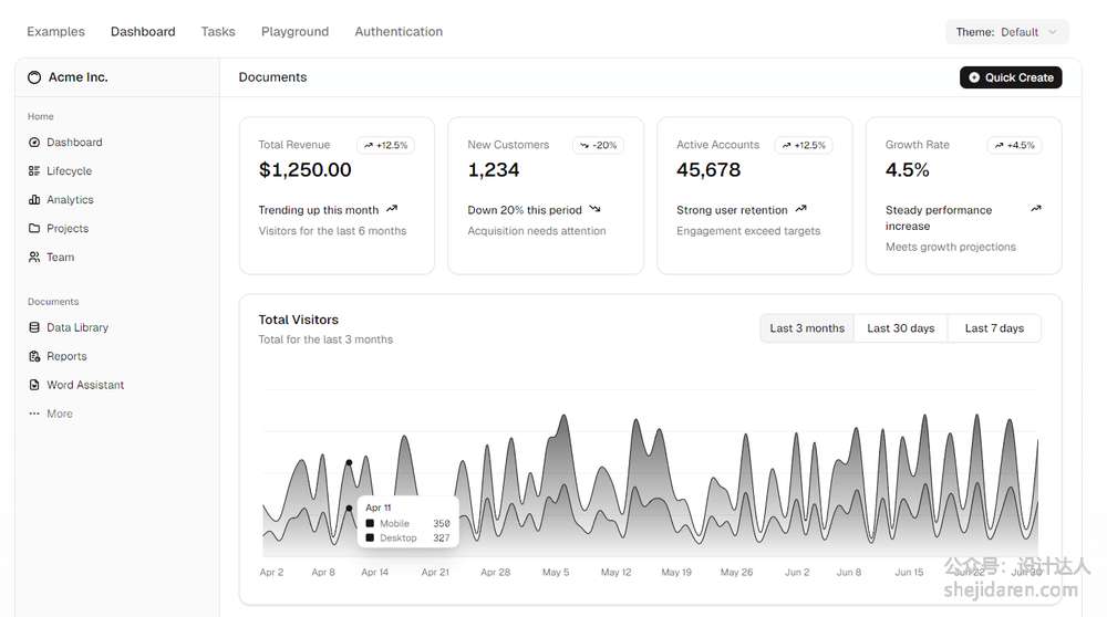 在导航与资源方面,Docs、Components、Blocks、Charts、Themes、Colors 等选项一应俱全,能帮你快速找到所需的参考和工具。而 Examples 板块里的 Dashboard、Tasks、Playground、Authentication 等示例,更是直观展示了组件的实际应用效果,为你的开发提供灵感。