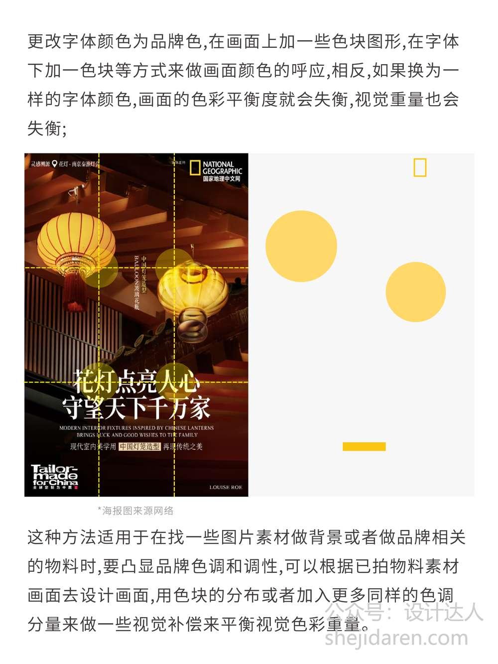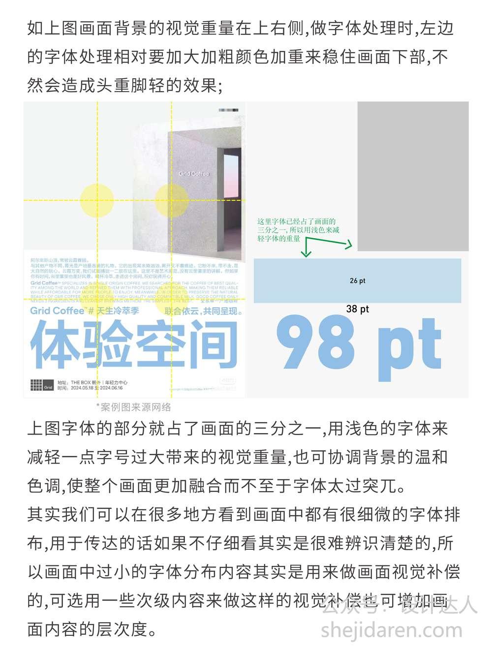 像有些画面背景的视觉重量集中在上右侧,这时处理左边字体时,就可以相对加大、加粗并加重颜色,以此稳住画面下部,避免出现头重脚轻的效果。还有当字体占了画面的三分之一时,选用浅色字体能减轻字号过大带来的视觉重量,同时协调背景的温和色调,让整个画面更融合,避免字体过于突兀。另外,画面中一些过小的字体分布内容,其实也是在做视觉补偿,选用次级内容来做还能增加画面内容的层次度。