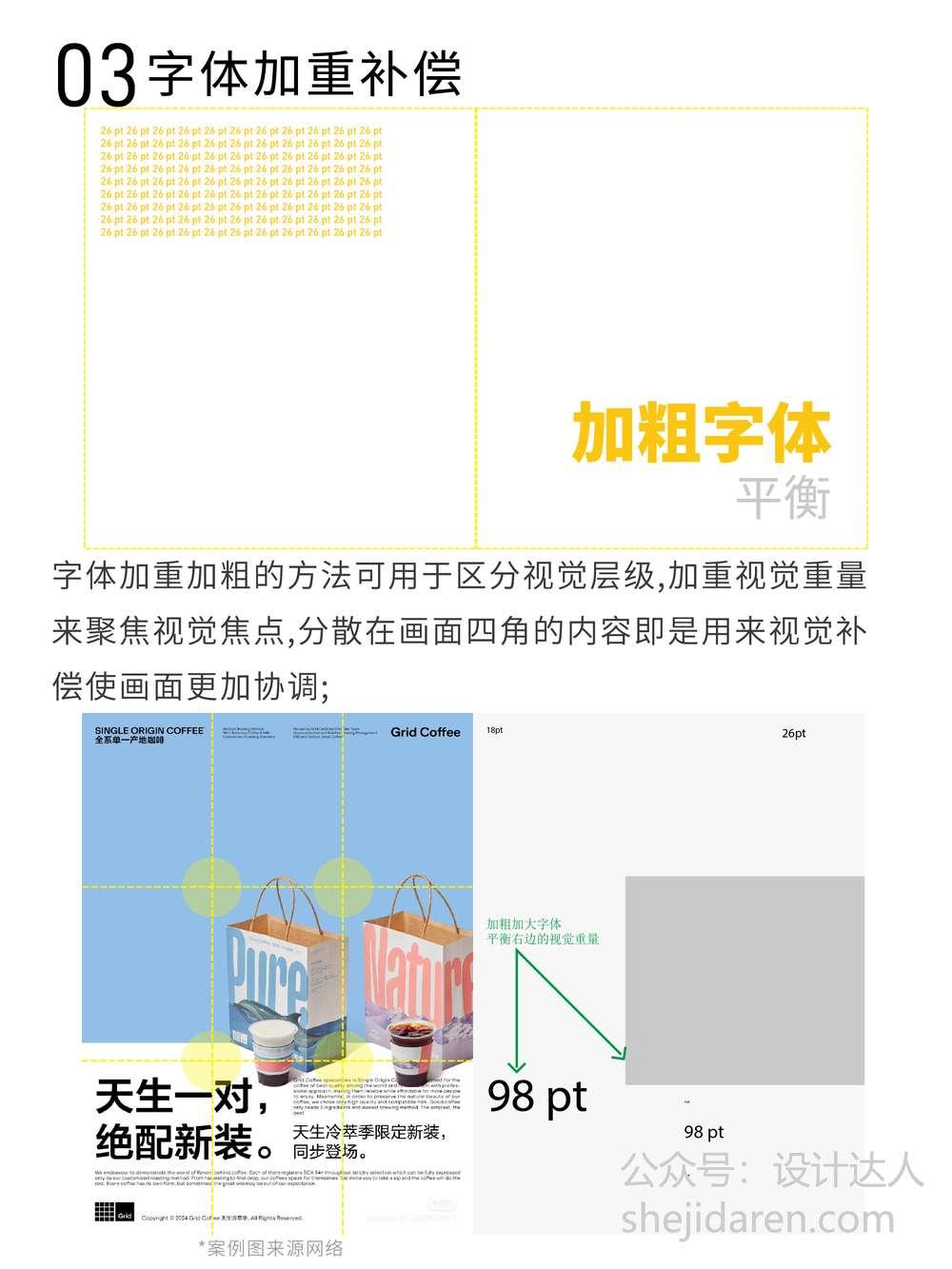 字体加重加粗是区分视觉层级的好方法,它能加重视觉重量,从而聚焦视觉焦点。那些分散在画面四角的内容,也能通过这种方式进行视觉补偿,让画面更加协调。