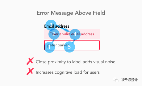 根据临近原则,当用户尝试去阅读错误信息提示或标签的时候,这两个文本会产生视觉混乱,所以结果是难以聚焦而让用户分心。
