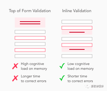 有研究发现,在表单上方显示错误信息提示,会对用户的记忆产生负担。当填写错误时,错误信息提示在最上方容易让用户在改正信息的时候要去回忆,到底是哪里填错了,怎样才能填正确。