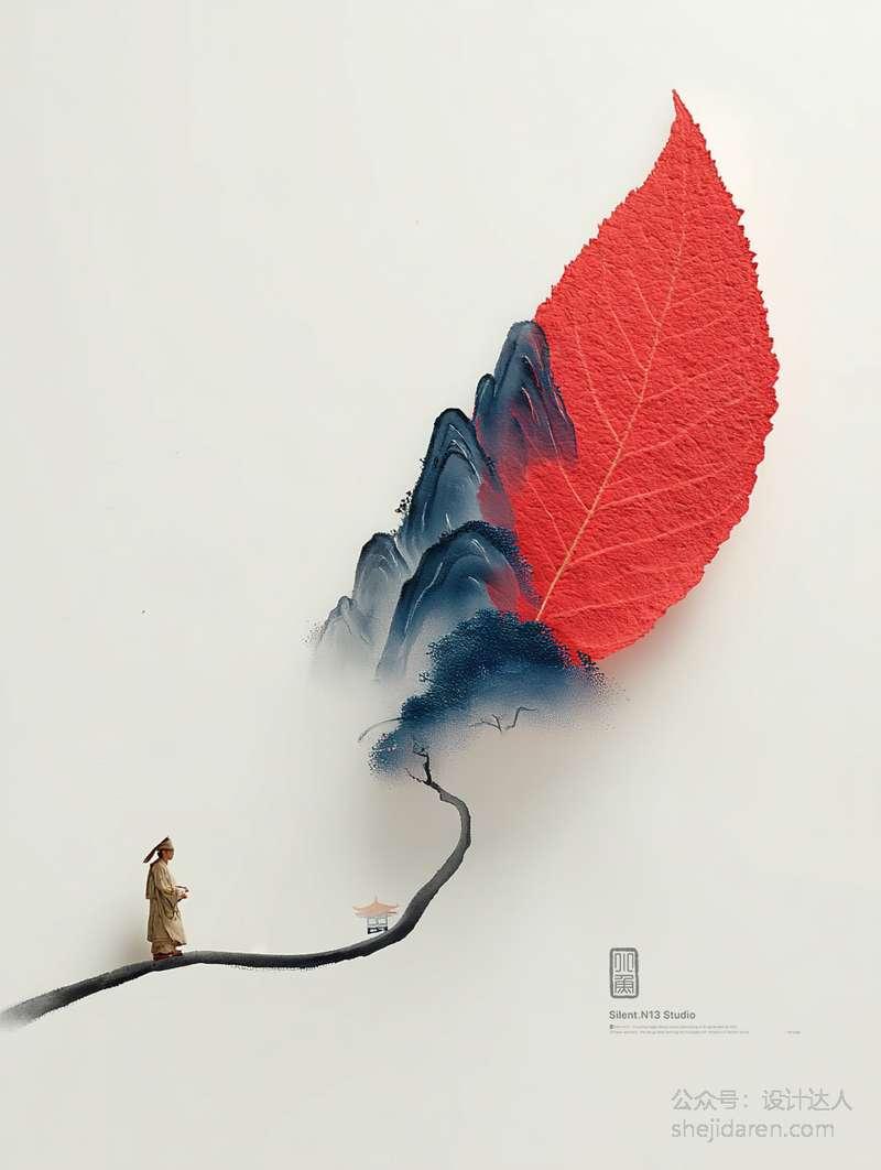 比如有一幅作品画面右侧那片红色的树叶纹理清晰,逼真到仿佛可以触摸。树叶与背景的山水画自然衔接,背景的山水画采用了典型的中国传统风格,冷色调的蓝、黑描绘出山峰和树木,营造出一种悠远、空灵的意境。